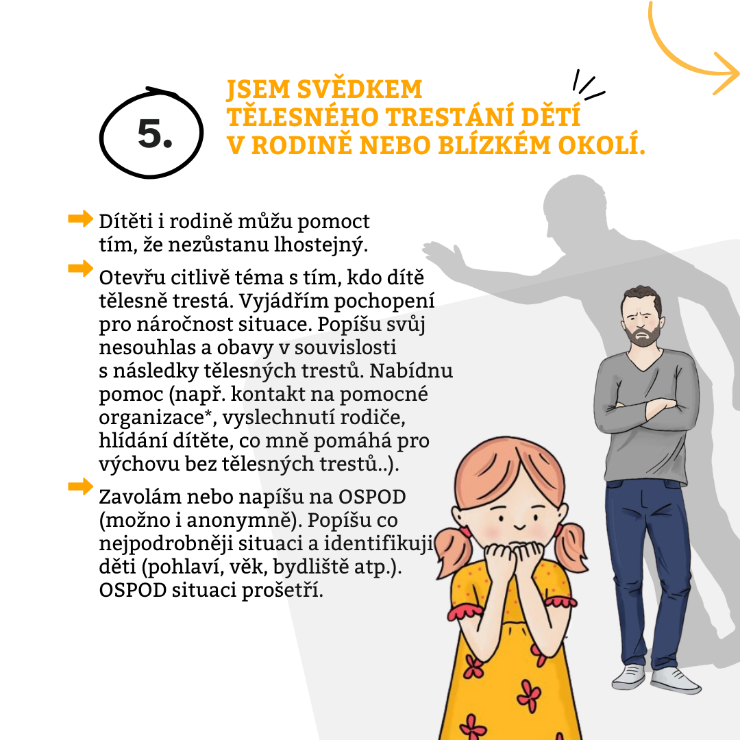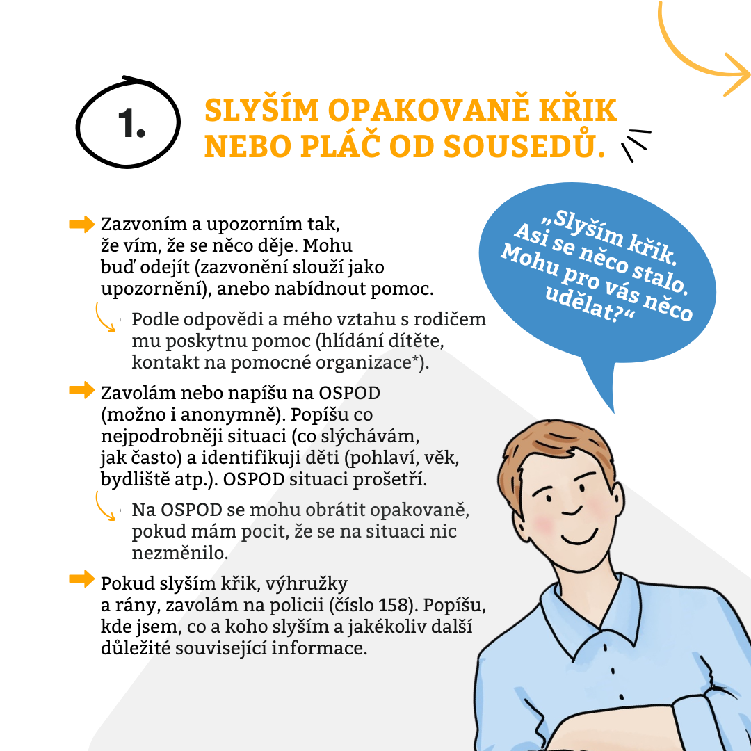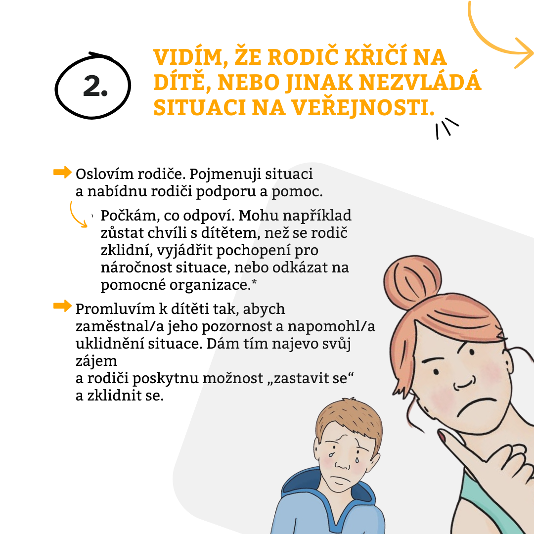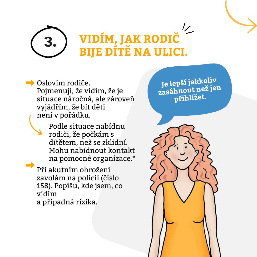 Máte podezření, že někdo ve vašem okolí ubližuje dítěti? Důležité nezůstávat lhostejní. I malá reakce může mít význam. Doporučení, jak se v jednotlivých situacích zachovat, najdete v našem letáku níže.