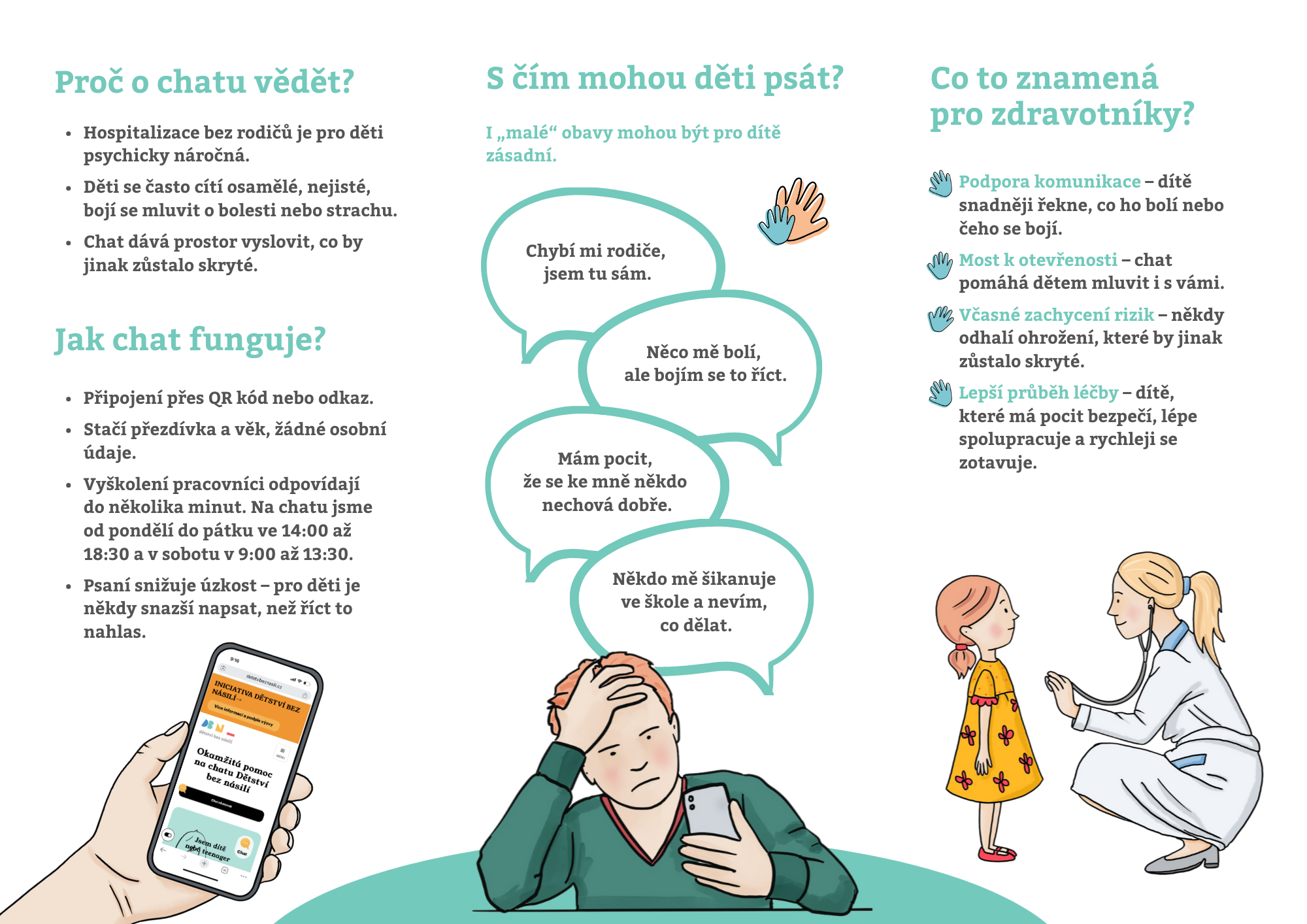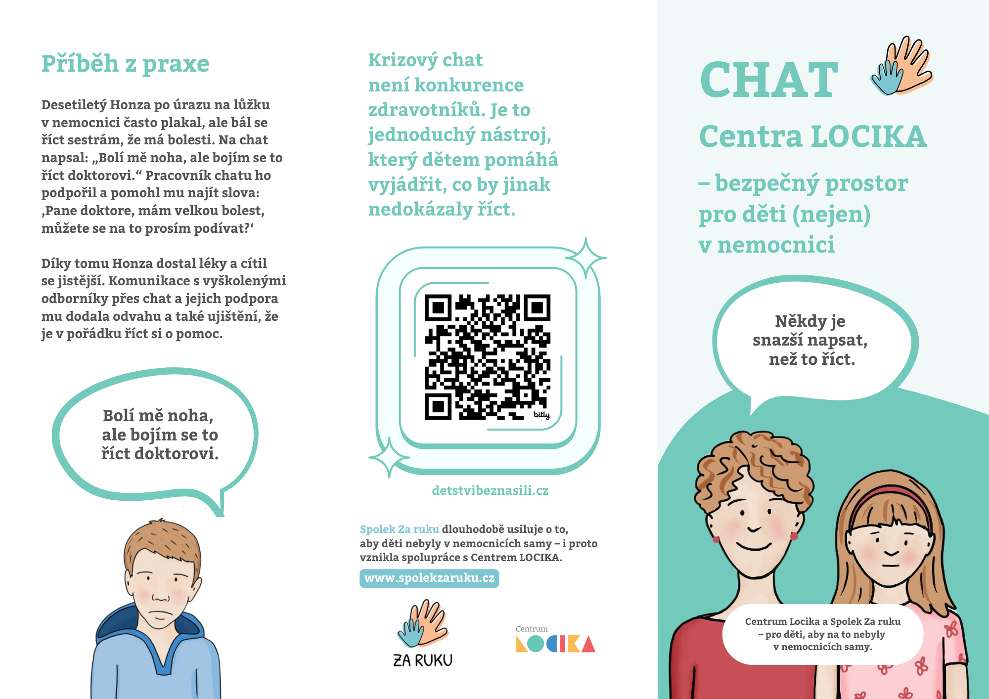 Centrum LOCIKA a spolek Za ruku spojily síly a vytvořily dva nové letáky, které budou k dispozici dětem pobývajícím v nemocnicích. Hospitalizace bez rodičů je pro děti psychicky náročná – často se cítí osamělé, nejisté a bojí se mluvit o bolesti nebo strachu. Tyto materiály představují bezpečný prostor na našem CHATU, kam se děti mohou obrátit s čímkoli, co je trápí – ať už je to strach, úzkost, stesk po rodině, nebo obtížné zážitky doma či ve škole.