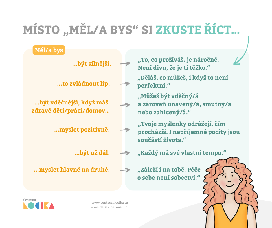 Někdy věta „Jsem v pořádku tak, jak jsem.“ může z dlouhodobého hlediska pomáhat daleko více. Protože i jazyk, kterým k sobě mluvíme, může být zdrojem úlevy.