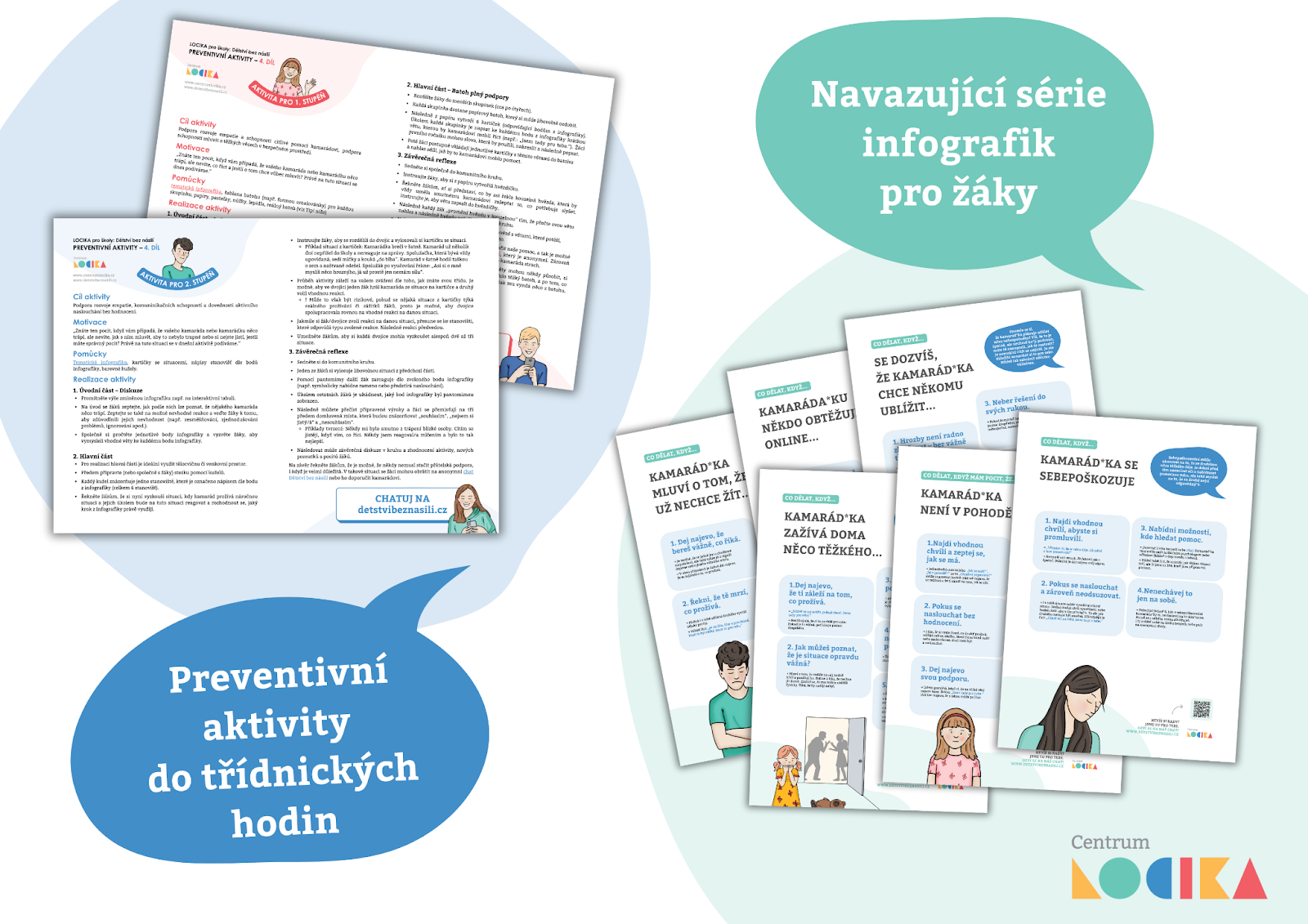 Na sérii navazují preventivní aktivity do třídnických hodin, které mohou školy snadno zařadit například do třídnických hodin. Každá aktivita rozvíjí jedno z témat infografik a pomáhá dětem otevřeně mluvit o vztazích, emocích a o tom, jak být oporou druhým.